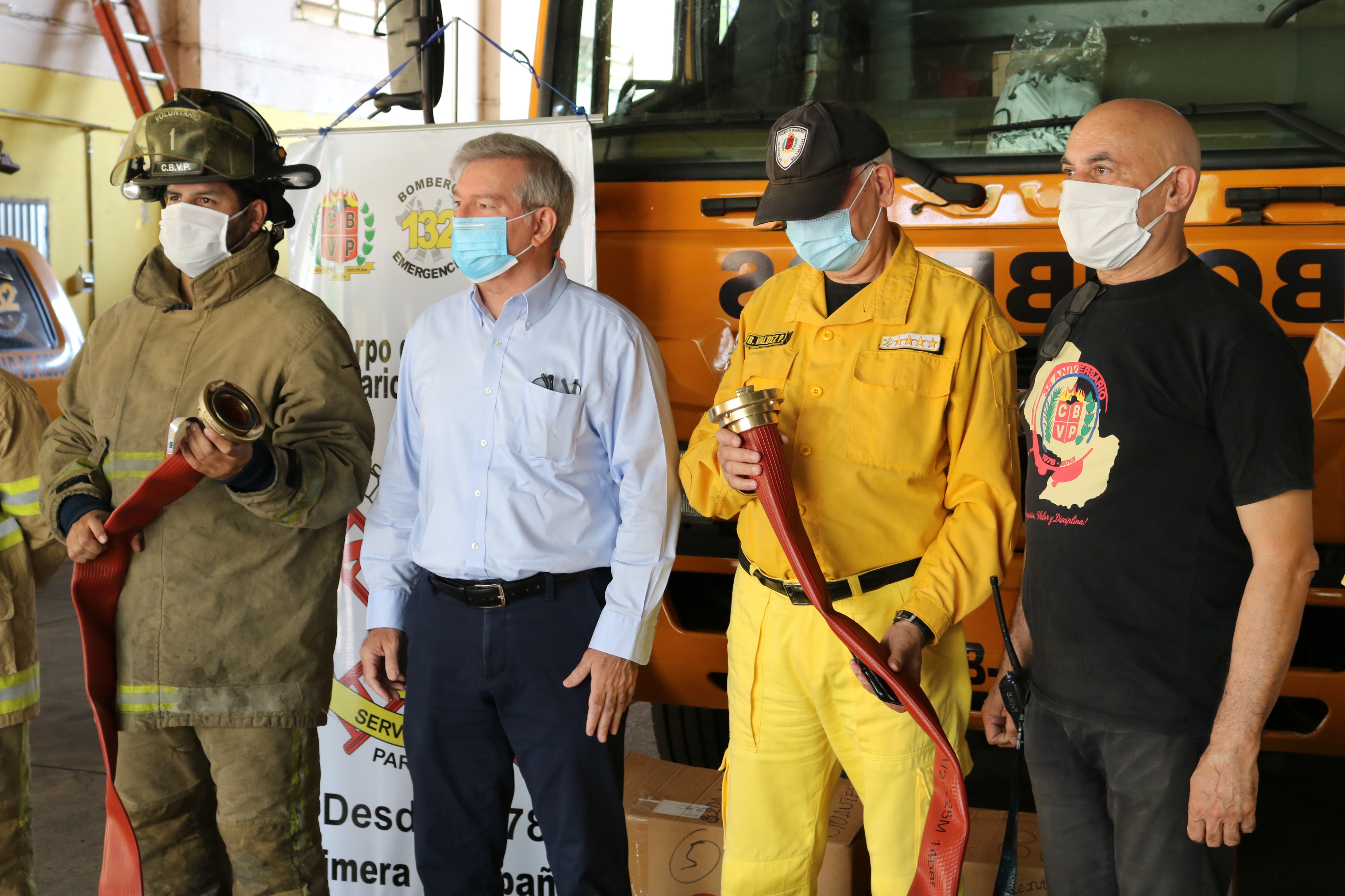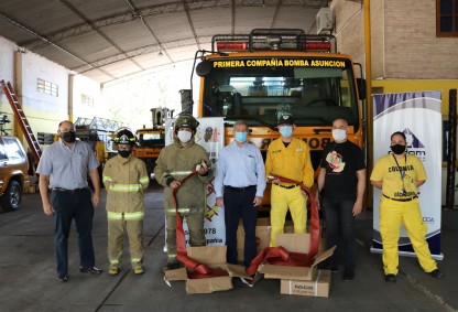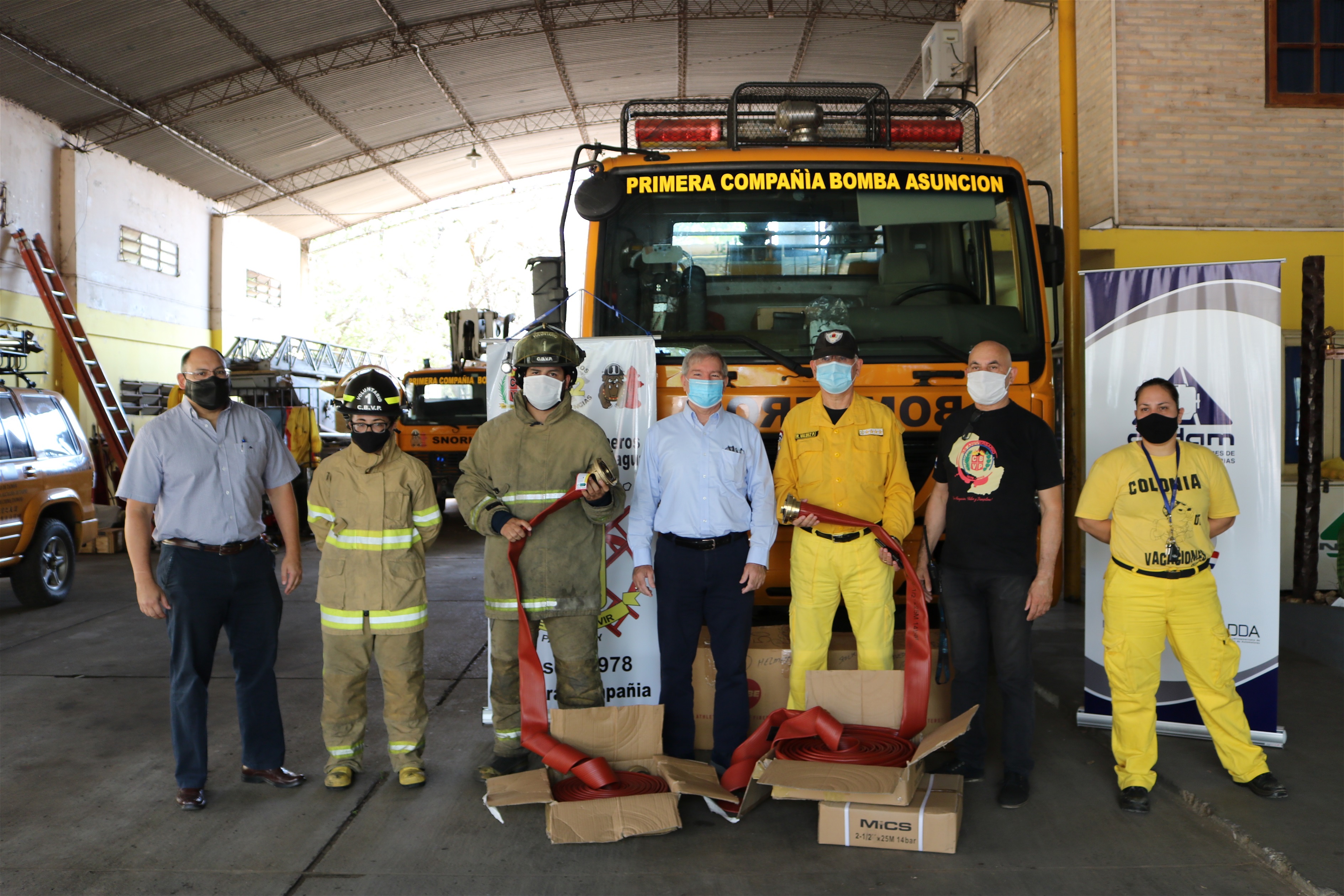En representación del Cuerpo de Bomberos Voluntarios del Paraguay, recibieron las mangueras el Capitán Rafael Valdez, Presidente, el Capitán Rubén Valdez, Comandante, y voluntarios de la Primera Compañía quienes harán uso inmediato de estas herramientas.