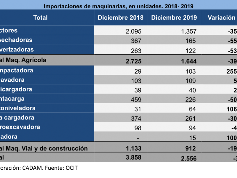 De enero a diciembre ingresaron 2.556 maquinarias nuevas, -33,7% respecto al año 2018. Las maquinari...