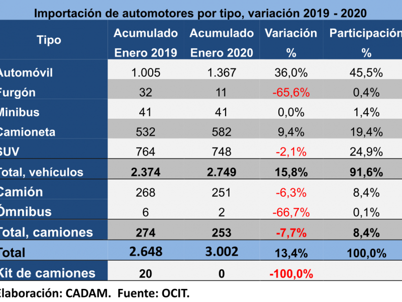 Al cierre del mes de enero fueron importados 3.002 vehículos livianos y camiones nuevos, 13,4% más q...